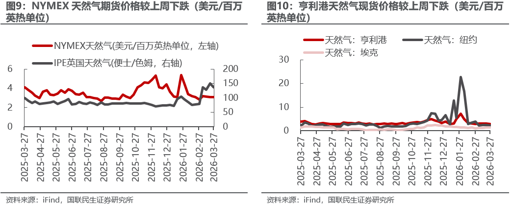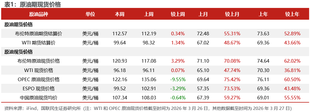 美元指数上升;布油价格上涨;东北亚LNG到岸价格下跌。截至3月27日,美元指数收于100.18,周环比+0.67个百分点。1)原油方面,布伦特原油期货结算价为112.57美元/桶,周环比+0.34%,现货价达120.93美元/桶,周环比+3.29%;WTI期货结算价为99.64美元/桶,周环比+1.34%。2)天然气方面,NYMEX天然气期货收盘价为3.08美元/百万英热单位,周环比-0.48%;东北亚LNG到岸价格为20.51美元/百万英热,周环比-9.77%。
