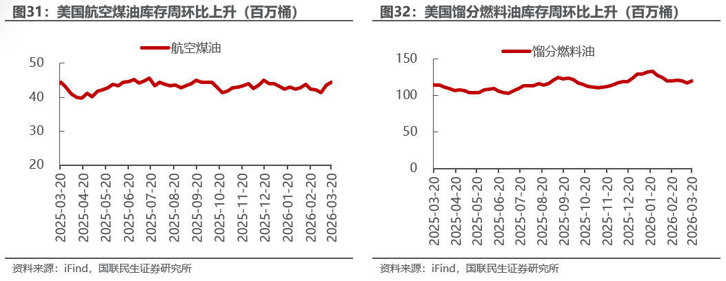 美国原油库存上升,汽油库存下降。截至3月20日,1)原油方面,美国战略原油储备41544万桶,周环比持平;商业原油库存45619万桶,周环比+693万桶。2)成品油方面,车用汽油/航空煤油/馏分燃料油库存分别为24145/4429/11994万桶,周环比-259/+67/+303万桶。