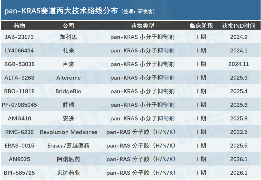 KRAS突变涉及约23%的人类癌症,在胰腺癌、结直肠癌、非小细胞肺癌等高发癌种中均有高比例突变,每年新增相关病例约为270万。在克服多种突变和耐药问题的巨大临床需求下,多家国内外企业涌入pan-KRAS赛道,形成小分子抑制剂与分子胶两大技术路线的分流与对抗。(见下图)