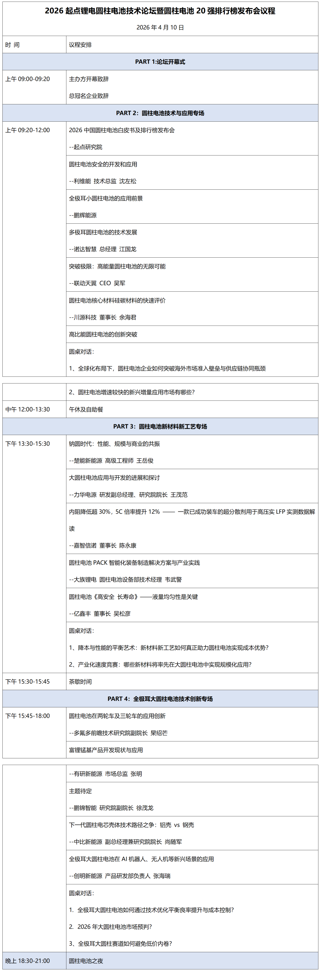 活动名称:2026(第二届)起点锂电圆柱电池技术论坛暨圆柱电池20强排行榜发布会