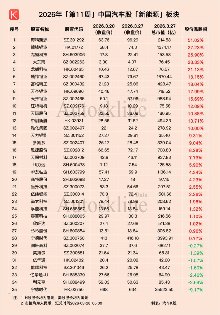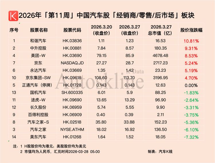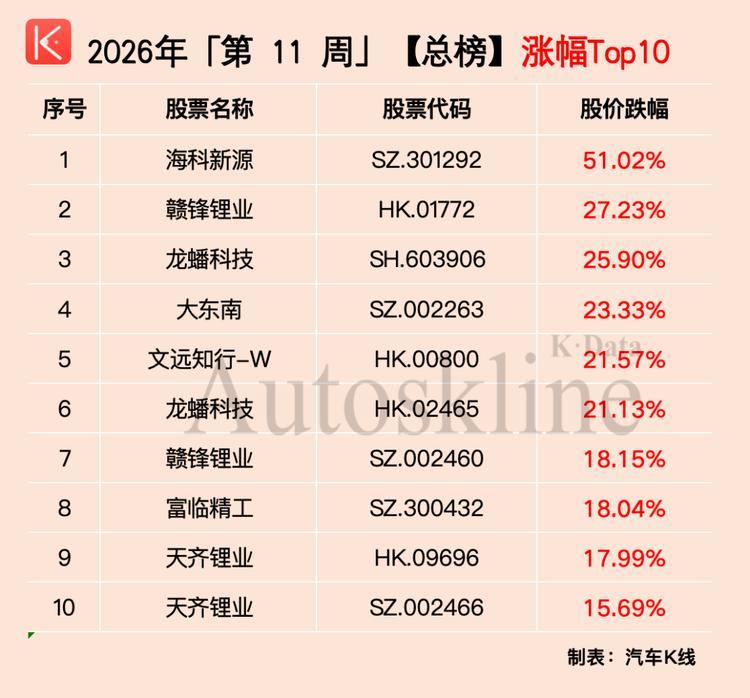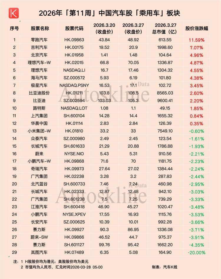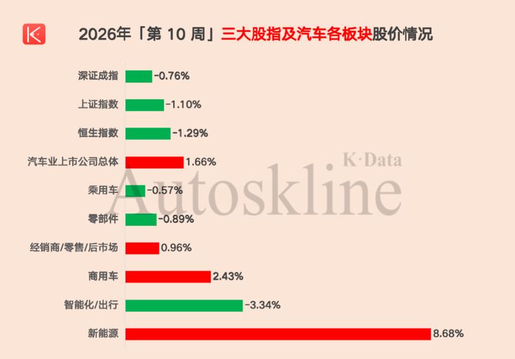 聚焦到汽车行业,得益于政策利好支撑,2026年第11周,《汽车K线》统计的136只中国汽车股,超半数实现上涨,一周平均股价上涨1.66%。