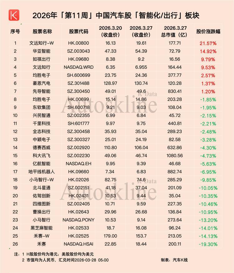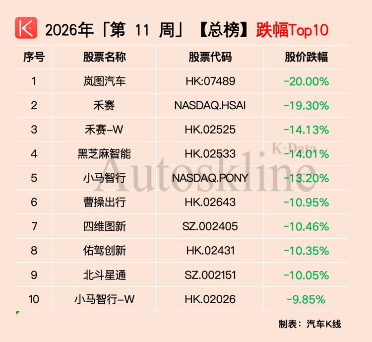 与新能源板块形成鲜明对比,第11周跌幅榜TOP10几乎被智驾概念股包揽。