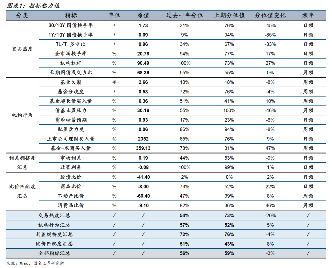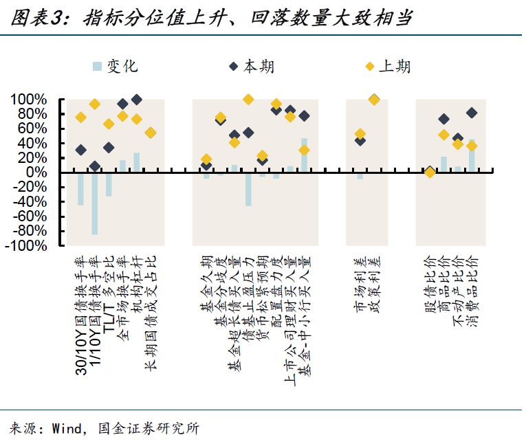 ①交易热度中,其中机构杠杆、全市场换手率分别上升27、17个百分点,1/10Y国债换手率、30/10Y国债换手率分别下降85、45个百分点,交易热度分位均值回落20个百分点。②机构行为类指标走势不一,不过其中基金-中小行买入量分位值大幅上升47个百分点,因此带动机构行为分位均值上升5个百分点。③市场、政策利差分位值分别下降9、上升1个百分点,利差分位均值下降4个百分点。④商品比价分位值大幅上升22个百分点,带动比价分位均值上升8个百分点。