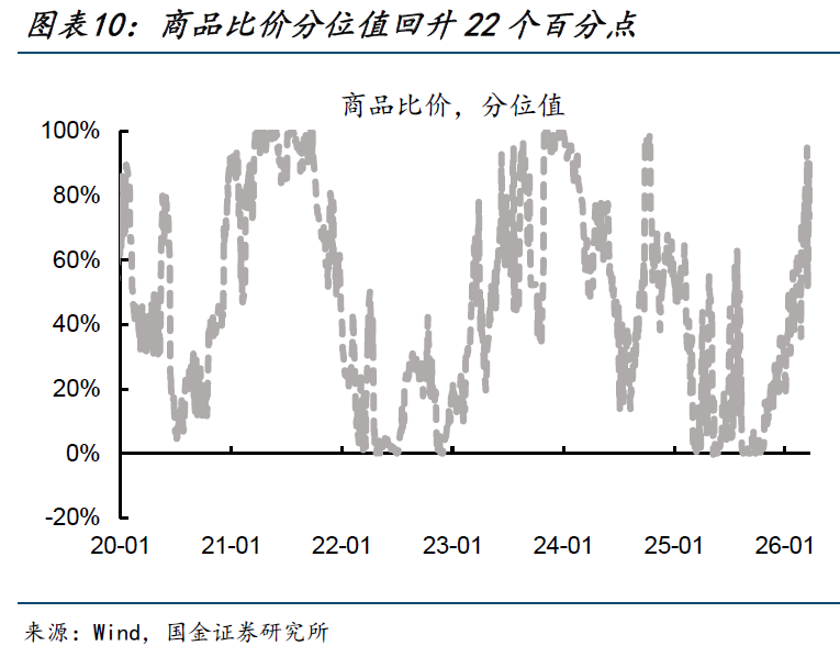 ②商品比价(过热):本期商品资产价格较前期基本持平,债券资产价格上升,商品比价上升8.4个百分点至-8%,对应过去一年分位值上升22个百分点至73%,由中性区间升至过热区间。