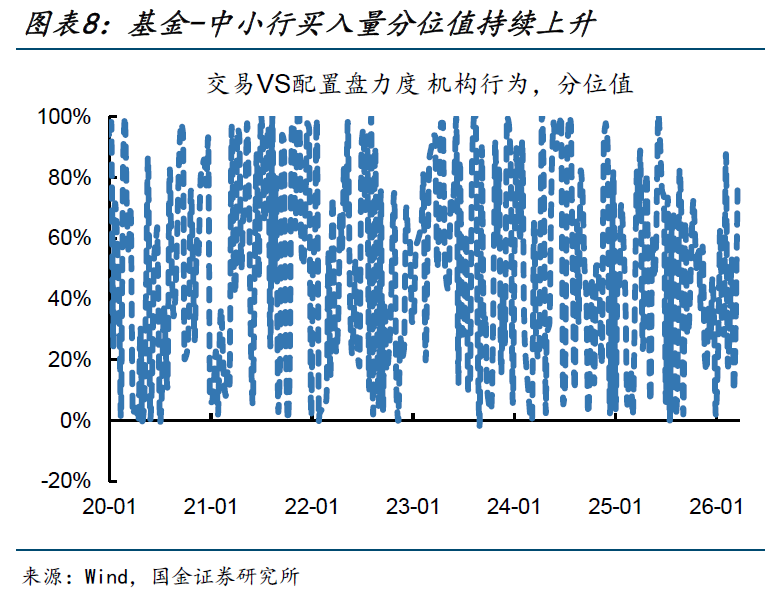 本期机构行为类指标中,位于过热区间的指标数量占比升至50%,位于中性区间的指标数量占比维持在25%,位于偏冷区间的指标数量占比降至25%。其中基金-中小行买入量比价上升47个百分比至78%,由偏冷区间升至过热区间。具体地: