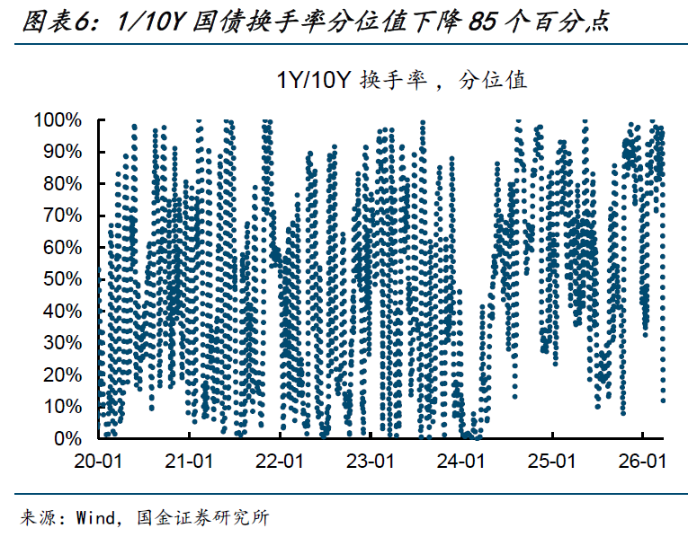 ⑥长期国债成交占比(中性):2026年2月长期国债成交占比较1月基本持平于68.36%,过去一年分位值也持平于55%。