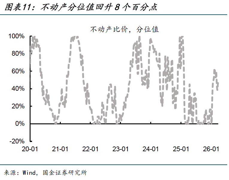 ③不动产比价(中性):本期不动产比价上升8.3个百分点-60.4%,过去一年分位值读数上升8个百分点至47%,由偏冷区间升至中间区间。
