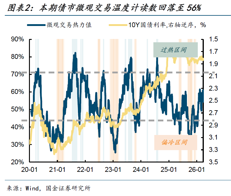 “国金证券固收-债市微观交易温度计”较上期小幅回落3个百分点至56%。本期主要是相对换手率分位值回落幅度较大,30/10Y、1/10Y换手率分位值分别下降45、85个百分点,除此外TL/T多空比分位值下降33个百分点,基金久期及分歧度、货币松紧预期、配置盘力度市场利差分位值小幅回落。而基金-中小行买入量、机构杠杆、商品比价、全市场换手率分位值分别上升47、27、22、17个百分点。当前拥挤度较高的指标包括全市场换手率、机构杠杆、政策利差。