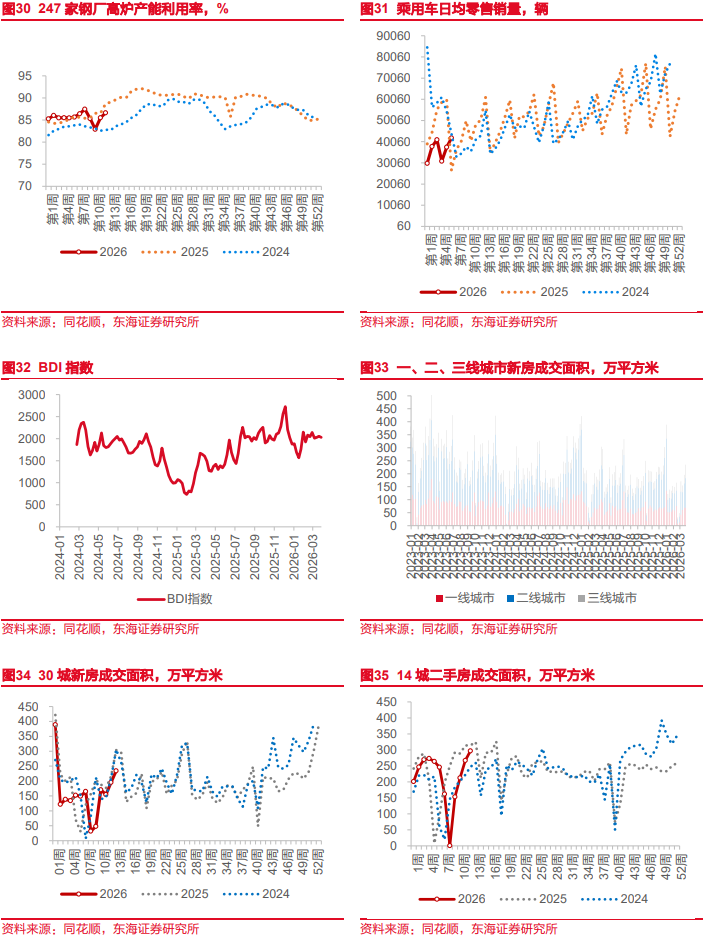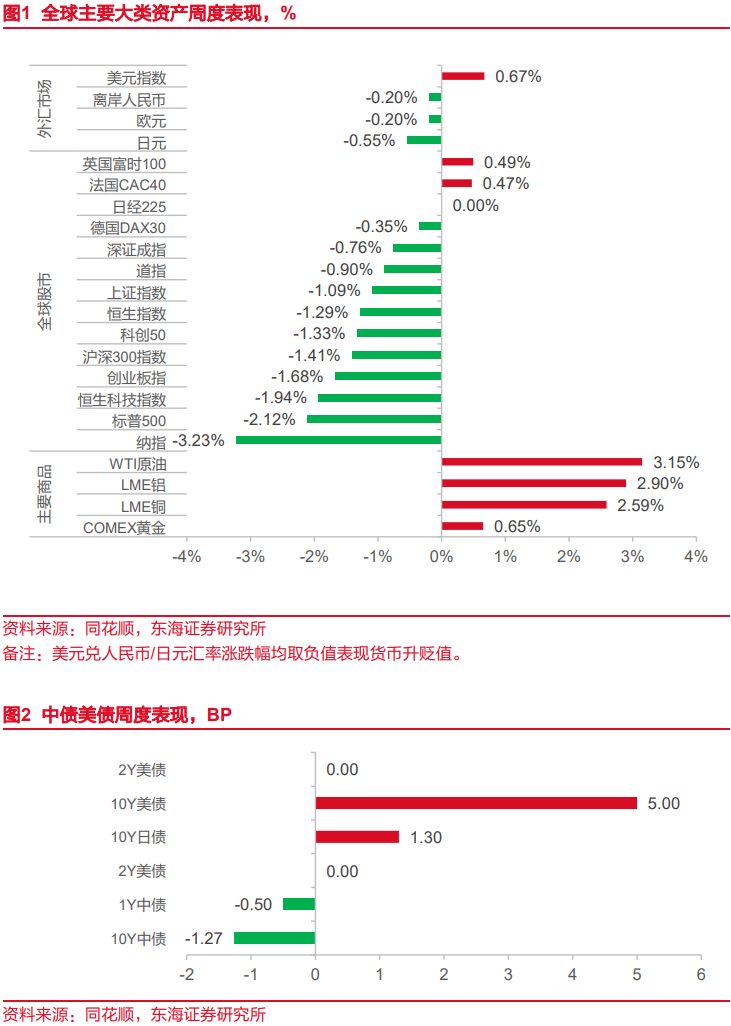 3月27日当周,全球股市多数收跌,英股、法股收涨;主要商品期货黄金、原油、铝、铜均反弹;美元指数上涨,人民币、欧元、日元贬值。1)权益方面:英国富时100>法国CAC40>日经225>德国DAX30>深证成指>道指>上证指数>恒生指数>科创50>沪深300指数>创业板指>恒生科技指数>标普500>纳指。国内来看,量价以及营收利润率的改善共同推动了1-2月工业企业利润增速的回升,不过春节错位影响下导致的低基数也是重要原因。3月基数因素消退后,利润增速或有回落,但基准情形下年内价格回升有望推动利润增速稳步上行,分子端利好权益。分母端来看,输入性通胀若超预期,或影响中下游利润空间,届时内需政策加码的窗口期或出现。海外来看,中东局势仍是扰动市场的主动因素,特朗普虽然TACO,但当前不确定性仍然较强。2)周一黄金一度下挫至最低4300美元,此后受特朗普TACO影响,降幅明显收窄,后续受中东局势影响维持震荡趋势。当前黄金价格的高位回落,除了交易型因素以外,也是向传统定价框架的回归。油价方面,供给担忧持续,当周上涨。后黄金受滞胀风险担忧,叠加美联储主席鲍威尔偏“鹰派”的新闻发布会发言影响,当周大幅下跌;中东局势继续扰动原油价格波动,当周高位震荡。3)工业品期货:南华工业品价格指数小幅下跌,水泥、混凝土、炼焦煤上涨,螺纹钢微跌;高炉开工率环比回升;截至3月22日当周,乘用车销量4.18万辆,环比11.72%,同比-16.00%;BDI环比下跌1.22%。4)国内利率债收益率回落,全周中债1Y国债收益率下跌0.50BP至1.2518%,10Y国债收益率下跌1.27BP收至1.8172%。5)美债收益率分化。2Y美债收益率当周收于3.88%,持平于上周,10Y美债收益率上行5BP至4.44%;10Y日债收益率上行1.3BP至2.2860%。6)美元指数收于100.1812,周上涨0.67%;离岸人民币对美元贬值0.20%;日元对美元贬值0.55%。