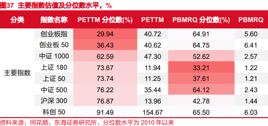主要指数估值(PE)分位数水平:创业板指<创业板50<中证1000<上证180<上证50<中证500<沪深300<科创50。