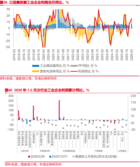 三因素框架下,量价以及营收利润率共同推动了1-2月工业企业利润增速的回升,不过春节错位影响下导致的低基数也是重要原因。开年以来,经济整体表现稳健,内需上投资升、消费稳,供给上生产强;出口也明显超预期。3月春节错位影响消退后,利润增速或有回落,但基准情形下年内价格回升有望推动利润增速稳步上行。当前不确定性较强的仍是地缘政治局势影响下,输入性通胀若超预期,或影响中下游利润空间,届时内需政策加码的窗口期或出现。