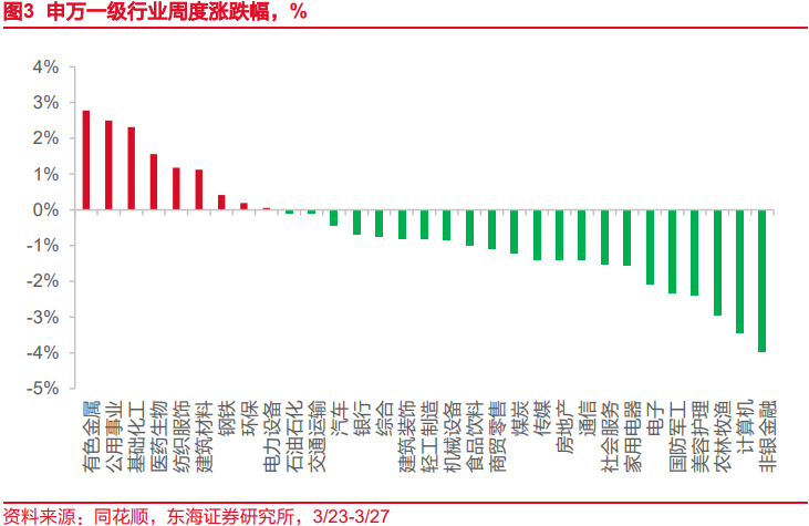 国内权益市场。3月27日当周,风格方面,周期>消费>成长>金融,日均成交额为20994亿元(前值21972亿元)。申万一级行业中,共有9个行业上涨,22个行业下跌。其中,涨幅靠前的行业为有色金属(+2.78%)、公用事业(+2.50%)、基础化工(+2.31%);跌幅靠前的行业为非银金融(-3.98%)、计算机(-3.44%)、农林牧渔(-2.94%)。