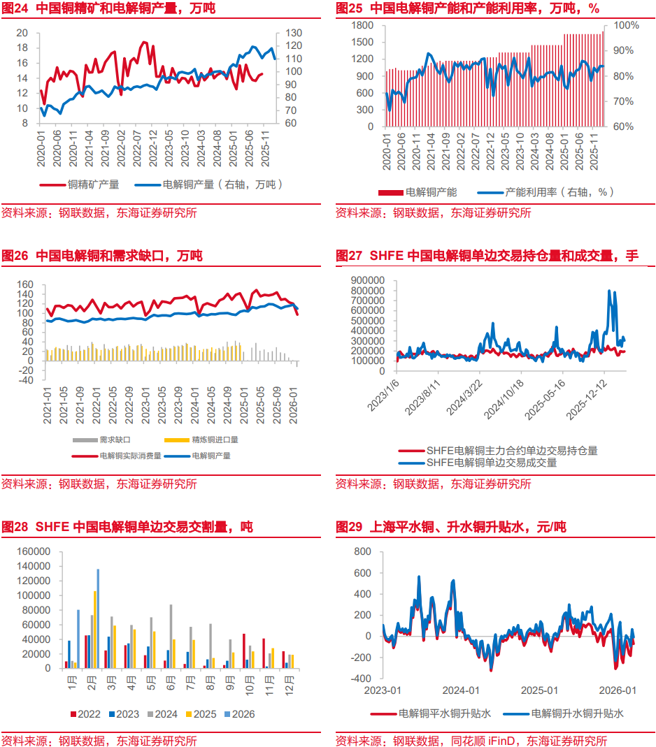2026年2月,我国电解铜产量约为109.98万吨,环比下降6.9%,同比增幅5.6%,生产能力复苏较上期回暖。2026年2月,我国电解铜年化平均产能为1698万吨,产能利用率为83.94%。2026年2月我国电解铜产量和需求缺口约为-12.62万吨,近年来产量首次超过实际消费量。我国进口电解精炼铜总量基本可以覆盖生产需求缺口。