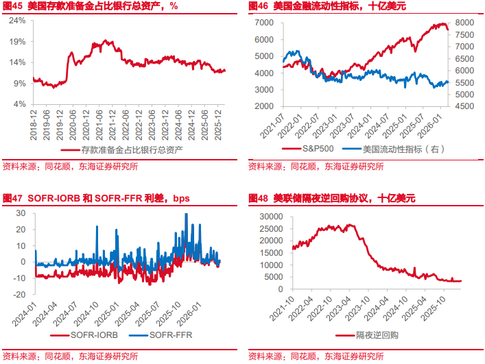 从量的角度来看,截至3月25日,美国流动性延续相对平稳。由于当周美联储资产端有136.9亿美元MBS到期,美联储RMP流动性注入较上周加量,升至164.7亿美元。同时,TGA当周向市场注入384.2亿美元流动性,大部分流入准备金账户,准备金与银行总资产占比回升至12.29%位于充裕区间上方。