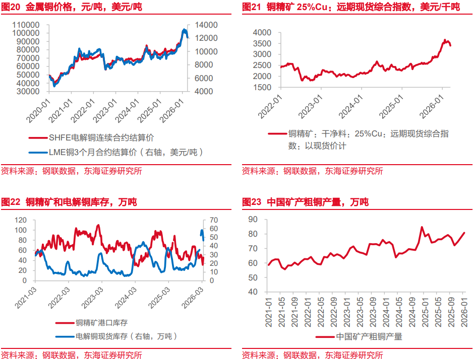 2026年,金属精炼铜价格震荡上行,3月27日当周,SHFE电解铜连续合约结算平均价格为94722元/吨,较上一周环比下降3%,价格与去年同比增长16.3%;LME伦铜3个月合约结算价为12102美元/吨。3月27日当周,我国铜精矿干净料(25%Cu)远期现货综合价格指数约为3313美元/干吨,价格环比下降2.6%。主要原因在于宏观情绪偏谨慎、资金风险偏好下降,同时下游需求恢复力度有限,电解铜库存压力仍存,对价格形成抑制;此外,冶炼厂采购保持谨慎,铜精矿现货成交偏弱,导致铜精矿(干净料25%Cu)远期现货综合指数同步走低。