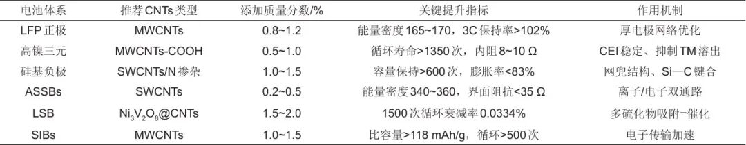 CNTs导电剂的添加量(0.5%~1.5%)显著低于传统炭基材料[2.0%~5.0%,主要包括超导炭黑(Super P)、乙炔黑等],其不仅降低电池内阻约30%,还能有效提升能量密度。在硅基负极中,CNTs能够有效缓冲高达300%的体积膨胀;在ASSBs中,仅添加0.2%~0.5%的SWCNTs即可实现340~360 Wh/kg能量密度;在4680大圆柱电池等新型电池体系中,CNTs的需求量为传统电池的2~3倍,而磷酸锰铁锂(LMFP)等正极体系也进一步拓展了其应用场景。具体如表2所示,其中,倍率性能以1 C放电容量为基准(100%),表示3 C倍率下的容量保持率;循环寿命以容量保持率80%为终止条件(1 C充放电);各性能指标与CNT的内在联系:①内阻降低:CNTs“线接触”机制减少活性颗粒间接触电阻(较传统炭黑降低30%~40%);②倍率性能提升:三维导电网络缩短电子传输路径(传输距离从100 nm降至20 nm),适配高电流密度下的电荷转移需求;③循环寿命延长:CNTs的力学支撑作用抑制活性颗粒粉化(如硅基负极循环100次后颗粒破碎率从50%降至15%),减少导电网络退化;④能量密度提升:低添加量(质量分数0.2%~1.5%)增加活性物质占比(较传统炭黑提升2%~4%),直接提升电池能量密度。