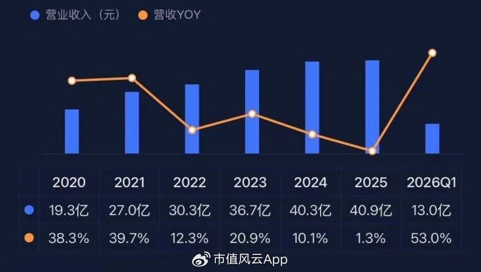 2026年一季报营收13.03亿,同比增长52.96%,归母净利润1.09亿,同比暴增159.13%。