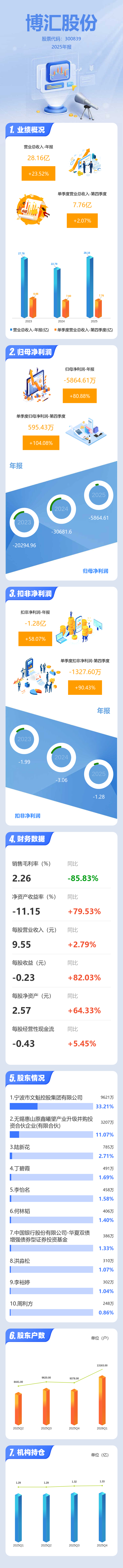 证券之星消息,博汇股份2025年年报显示,当年度公司主营收入28.16亿元,同比上升23.52%;归母净利润-5864.61万元,同比上升80.89%;扣非净利润-1.28亿元,同比上升58.08%;其中2025年第四季度,公司单季度主营收入7.76亿元,同比上升2.08%;单季度归母净利润595.43万元,同比上升104.08%;单季度扣非净利润-1327.6万元,同比上升90.43%;负债率56.54%,投资收益7295.44万元,财务费用4633.09万元,毛利率2.26%。