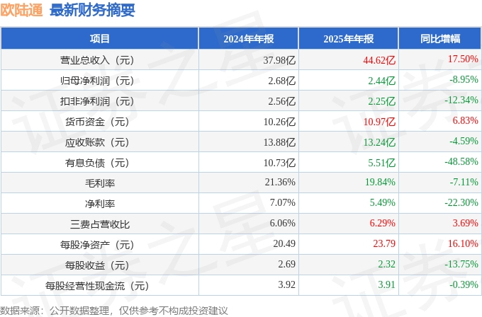 据证券之星公开数据整理,近期欧陆通(300870)发布2025年年报。截至本报告期末,公司营业总收入44.62亿元,同比上升17.5%,归母净利润2.44亿元,同比下降8.95%。按单季度数据看,第四季度营业总收入10.75亿元,同比下降5.2%,第四季度归母净利润2234.77万元,同比下降79.93%。本报告期欧陆通公司应收账款体量较大,当期应收账款占最新年报归母净利润比达542.69%。