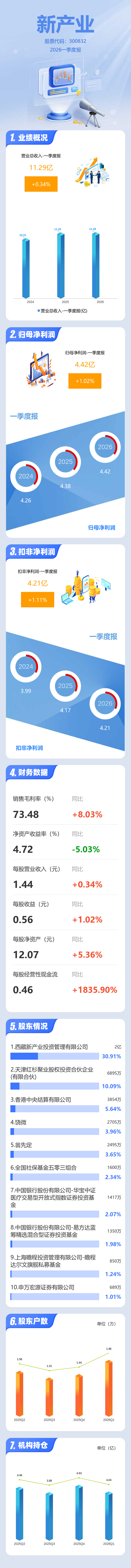 证券之星消息,新产业2026年一季报显示,一季度公司主营收入11.29亿元,同比上升0.34%;归母净利润4.42亿元,同比上升1.02%;扣非净利润4.21亿元,同比上升1.11%;负债率7.14%,投资收益1928.64万元,财务费用3231.55万元,毛利率73.48%。