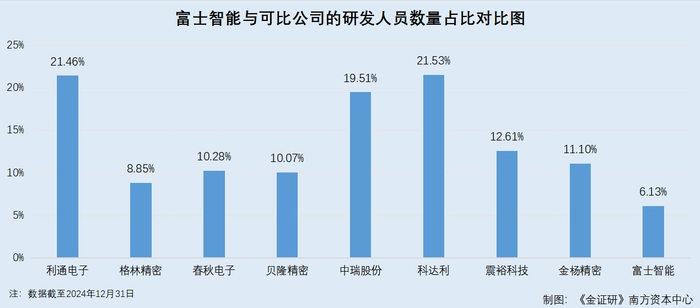 不仅如此,富士智能的研发人员数量占比低于同行。