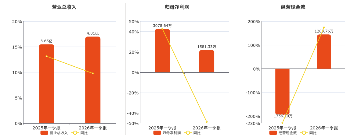 公司营业总收入为4.01亿元。归母净利润为1581.33万元,较去年同报告期归母净利润减少1497.32万元,同比较去年同期下降48.64%。经营活动现金净流入为1283.76万元。