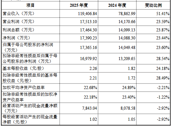 2025年度,公司实现营业收入119,406.84万元,较上年增长51.41%;实现归属于母公司股东的净利润17,365.16万元,较上年增长23.60%;实现扣除非经常性损益后归属于母公司股东的净利润16,979.92万元,较上年增长28.54%;经营活动产生的现金流量净额7,843.04万元。