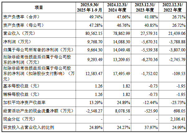 2022年至2025年1-9月,公司实现营业收入分别为21,439.06万元、27,579.31万元、78,862.99万元、80,562.15万元,净利润分别为-3,788.88万元、-5,670.31万元、14,088.30万元、9,768.70万元,归属于母公司所有者的净利润分别为-3,807.00万元、-5,539.38万元、14,049.48万元、9,664.30万元,扣除非经常性损益后归属于母公司股东的净利润分别为-2,745.79万元、-6,270.36万元、13,209.65万元、9,293.49万元。