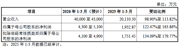 2026年1-3月,公司预计实现营业收入40,000万元至43,000万元,较上年同期增长98.90%至113.82%;预计实现归属于母公司股东的净利润4,300万元至5,100万元,较上年同期增长122.47%至163.86%;预计实现扣除非经常性损益后归属于母公司股东的净利润4,100万元至4,900万元,较上年同期增长134.09%至179.77%。