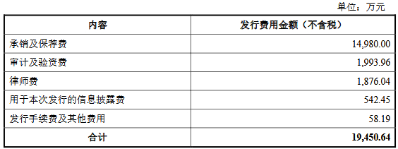 公司本次发行费用(不含增值税)合计19,450.64万元,其中承销及保荐费14,980.00万元。