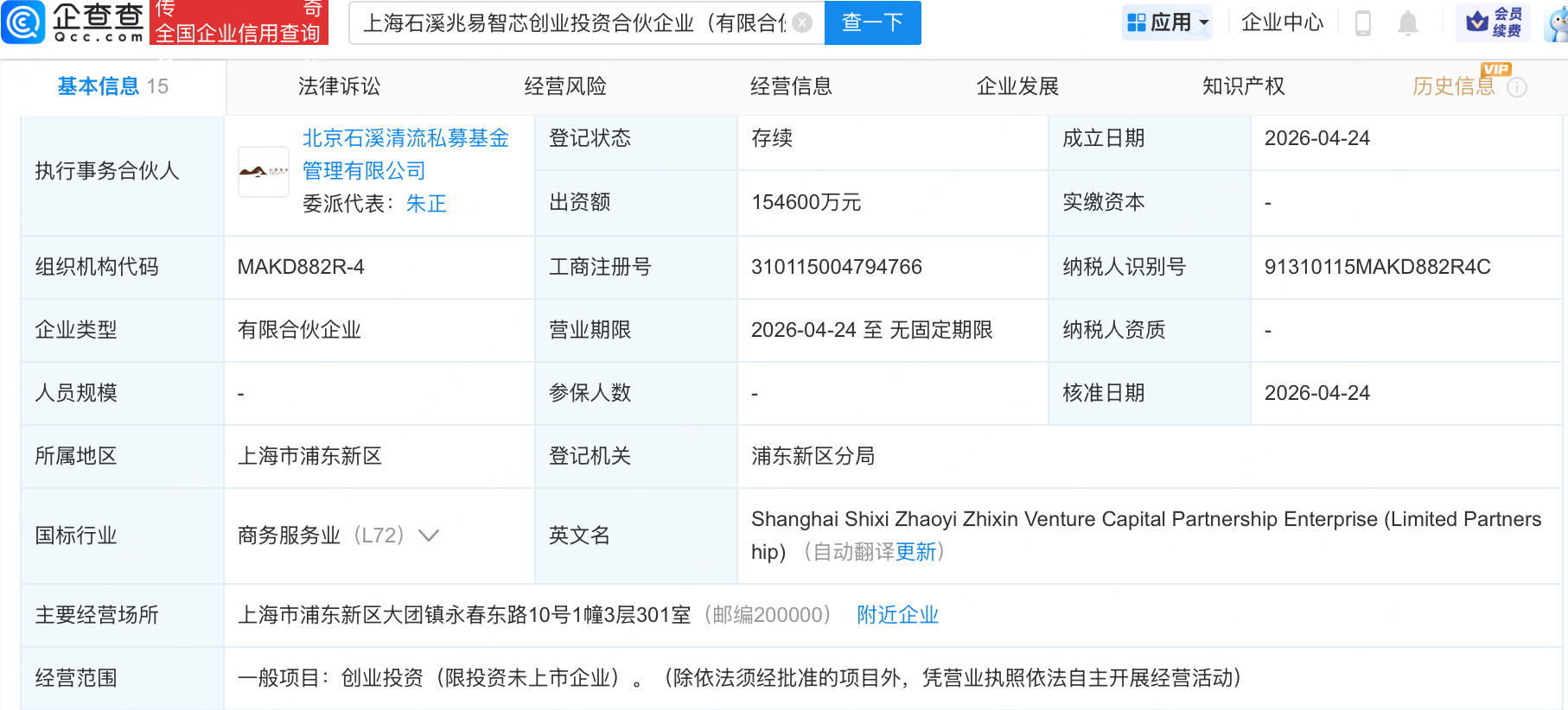 企查查APP显示,近日,上海石溪兆易智芯创业投资合伙企业(有限合伙)成立,出资额15.46亿元,经营范围包含:创业投资(限投资未上市企业)。企查查股权穿透显示,该企业由精智达(688627.SH)、兆易创新(603986.SH)等共同出资。