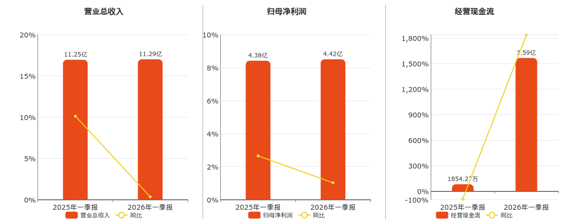 公司营业总收入为11.29亿元。归母净利润为4.42亿元。经营活动现金净流入为3.59亿元。