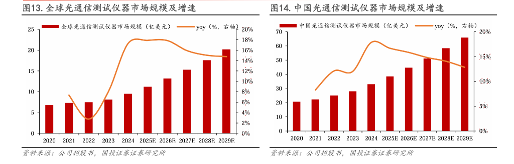 市场空间方面,根据Frost & Sullivan数据,2024年中国光通信测试仪器市场规模达33.0亿元,预计2029年增至65.9亿元;全球市场同期从9.5亿美元扩张至20.2亿美元。