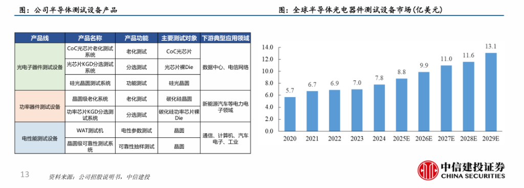 在光芯片测试方面,公司的三款半导体测试设备实现全链路贯通:硅光晶圆测试系统覆盖晶圆级功能测试,光芯片KGD分选测试系统覆盖裸Die级分选,CoC光芯片老化测试系统覆盖封装级老化测试。2024年公司在中国光电子器件测试设备市场份额排名第一。