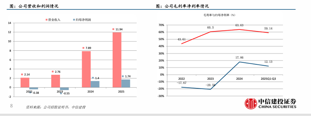 联讯仪器近三年收入年均复合增速约77%,盈利能力显著改善。毛利率从2022年的43.61%大幅提升至2024年的63.63%,2025年为58.84%。研发投入持续加码,2022至2024年累计研发投入3.50亿元,2025年1至9月研发费用占营收比例达24.89%,截至2025年9月末研发人员440人,占员工总数约40%,已授权发明专利113项。