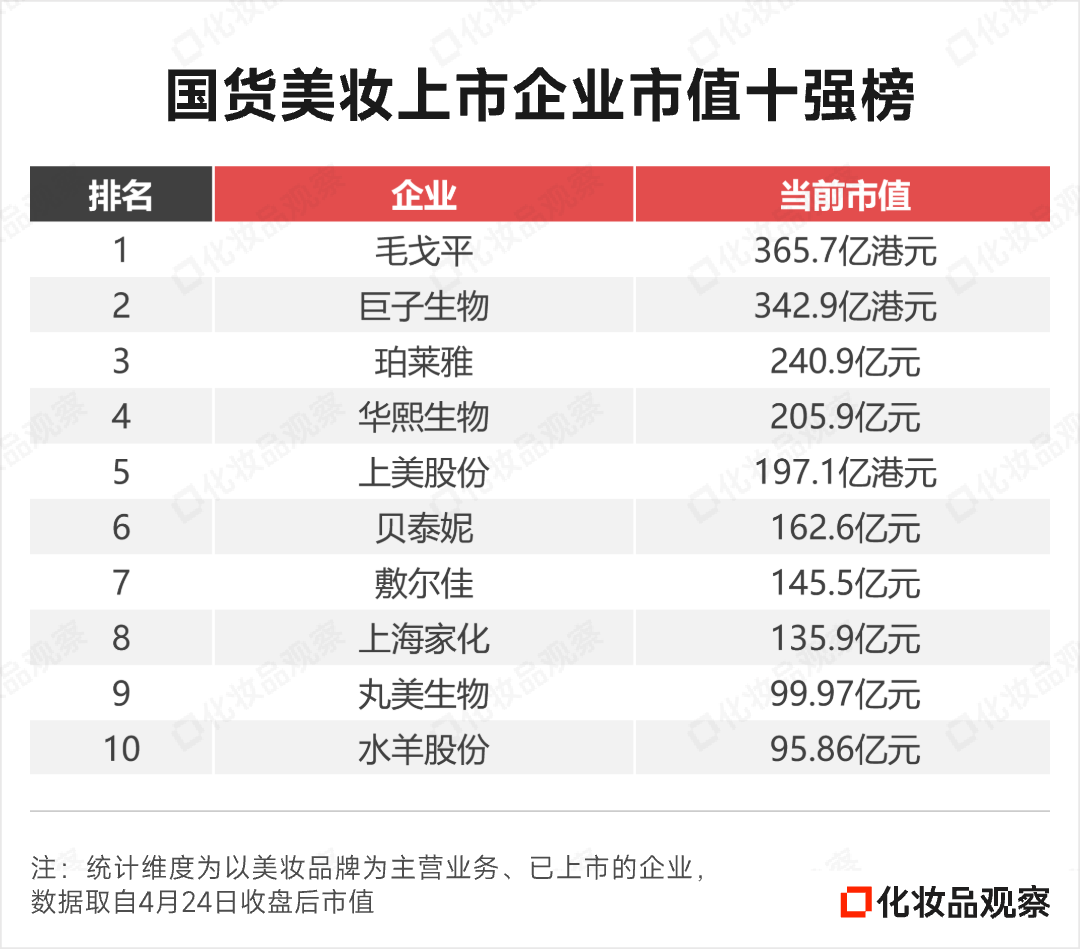 50亿级阵营洗牌加剧:华熙生物跌破50亿元,而毛戈平首次突破50亿,成为该阵营的新成员。