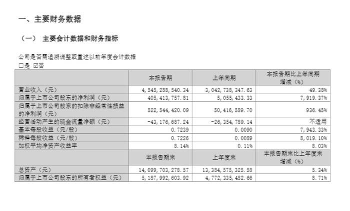 飞南资源(301500)4月24日晚间公告称,2026年第一季度实现营业收入45.45亿元,同比增长49.38%;归属于上市公司股东的净利润为4.05亿元,同比增长7919.37%。
