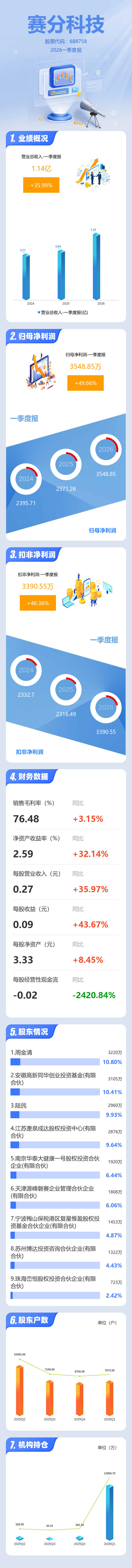 证券之星消息,赛分科技2026年一季报显示,一季度公司主营收入1.14亿元,同比上升35.99%;归母净利润3548.85万元,同比上升49.66%;扣非净利润3390.55万元,同比上升46.37%;负债率8.91%,投资收益98.83万元,财务费用-218.96万元,毛利率76.48%。