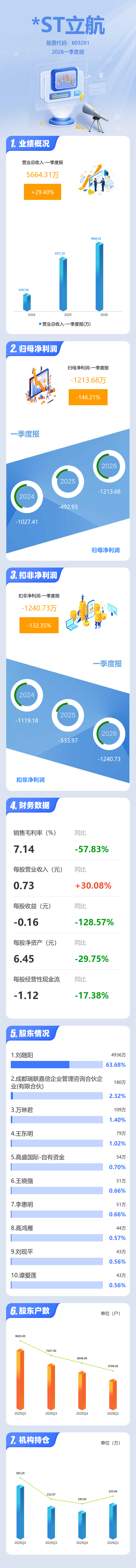 证券之星消息,*ST立航2026年一季报显示,一季度公司主营收入5664.31万元,同比上升29.4%;归母净利润-1213.68万元,同比下降146.22%;扣非净利润-1240.73万元,同比下降132.36%;负债率45.22%,财务费用78.35万元,毛利率7.14%。
