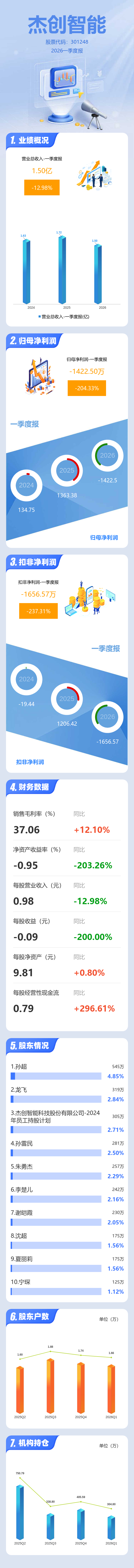 证券之星消息,杰创智能2026年一季报显示,一季度公司主营收入1.5亿元,同比下降12.98%;归母净利润-1422.5万元,同比下降204.34%;扣非净利润-1656.57万元,同比下降237.31%;负债率73.77%,投资收益4.9万元,财务费用1452.22万元,毛利率37.06%。