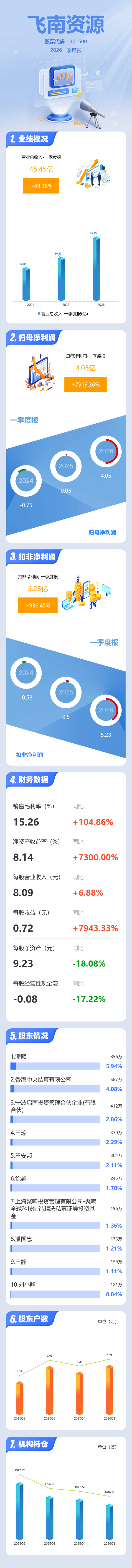 证券之星消息,飞南资源2026年一季报显示,一季度公司主营收入45.45亿元,同比上升49.38%;归母净利润4.05亿元,同比上升7919.37%;扣非净利润5.23亿元,同比上升936.45%;负债率61.53%,投资收益3299.82万元,财务费用4478.61万元,毛利率15.26%。