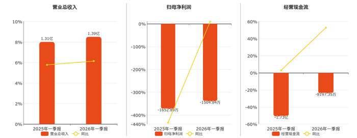 公司营业总收入为1.39亿元。归母净利润为-1504.84万元。经营活动现金净流入为-8197.35万元。