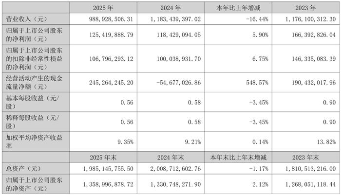 2025年,芯瑞达实现营业总收入9.89亿元,同比下降16.44%;归母净利润1.25亿元,同比增长5.90%;扣非净利润1.07亿元,同比增长6.75%。