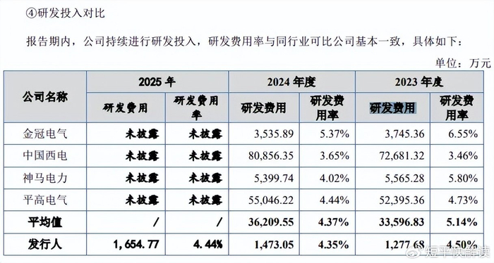 另外,2023年、2024年,可比同行研发费用率均值均超过公司,分别为5.14%、4.37%,进一步来看,金冠电气、平高电气2024年研发费用率均超过公司,分别为5.37%、4.44%,而神马电力、中国西电分别为4.02%、3.65%。