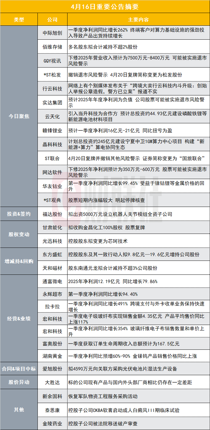*ST松发(603268.SH)公告称,公司股票将于4月17日停牌一天,自4月20日起复牌交易并撤销退市风险警示。证券简称由“*ST松发”变更为“松发股份”,证券代码仍为603268,股票价格的日涨跌幅限制由5%变为10%。此前,公司因2024年度财务指标触及规定被实施退市风险警示。经审计,公司2025年度实现营收216.39亿元,净利润26.55亿元,扣非净利润20.33亿元,年末归母净资产94.52亿元。鉴于导致退市风险警示的情形已消除,且会计师事务所出具标准无保留意见审计报告,上交所同意公司撤销退市风险警示申请。
