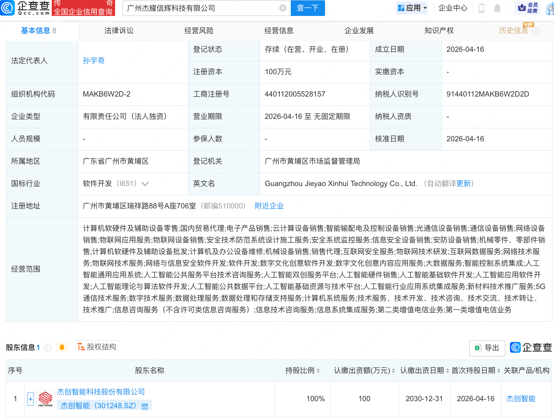 企查查APP显示,近日,广州杰耀信辉科技有限公司成立,经营范围包含:人工智能基础软件开发;人工智能应用软件开发;人工智能理论与算法软件开发;人工智能公共数据平台等。企查查股权穿透显示,该公司由杰创智能(301248.SZ)全资持股。