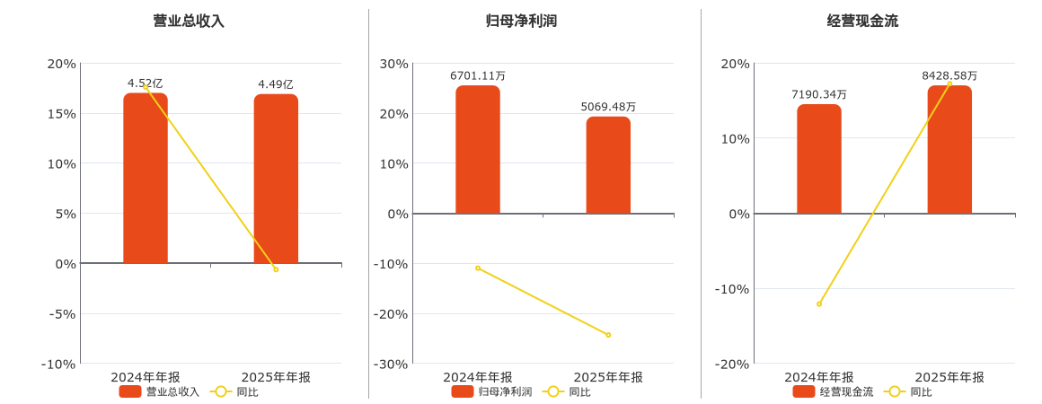 公司营业总收入为4.49亿元,在已披露的同业公司中排名第104,较去年同报告期营业总收入减少291.93万元,同比较去年同期下降0.65%。归母净利润为5069.48万元,在已披露的同业公司中排名第82,较去年同报告期归母净利润减少1631.63万元,同比较去年同期下降24.35%。经营活动现金净流入为8428.58万元,在已披露的同业公司中排名第75。