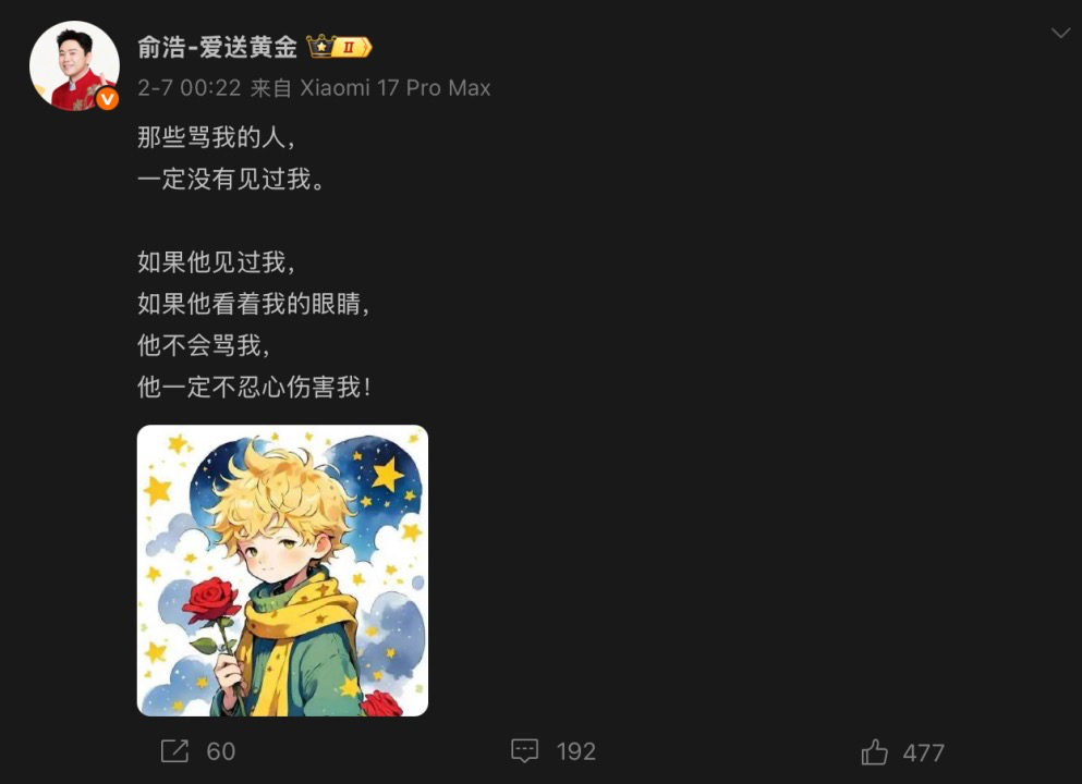 2月7日00:22,夜半,俞浩在微博上发了一条微博,“那些骂我的人,一定没有见过我。如果他见过我,如果他看着我的眼睛,他不会骂我,他一定不忍心伤害我!”50字左右的文案,配图是眼神温柔的小王子拿着玫瑰,看向屏幕外。