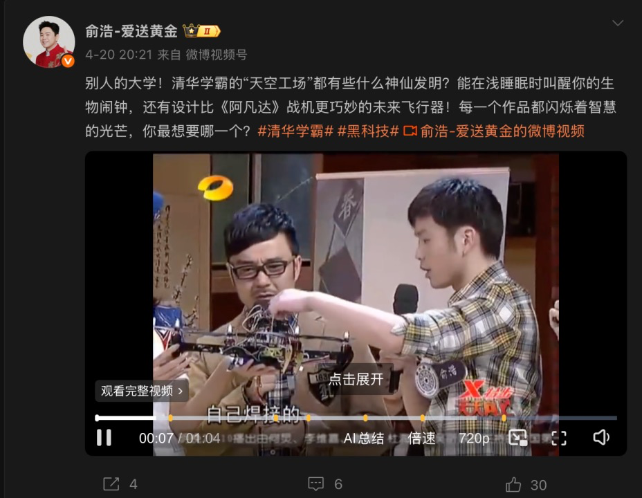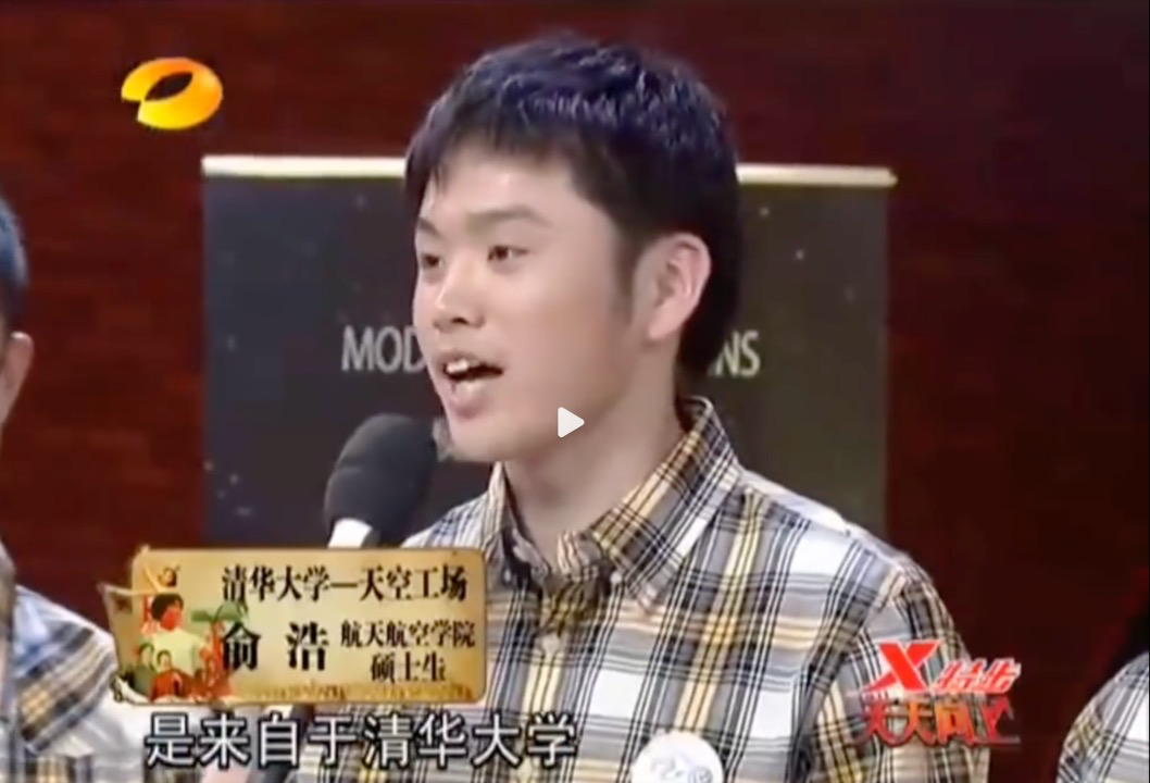 4月20日晚,俞浩在微博上连发了4条他在《天天向上》的视频。视频里的他,还是清华大学“天空工场”、清华大学航天航空学院硕士生的身份。