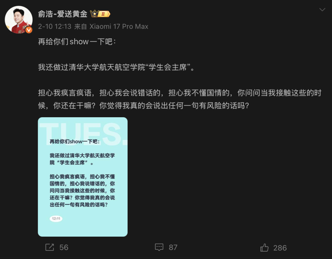 狂言妄语的间隙,偶尔也能在同一处,看到另一面。他半夜发微博说,自己经常会哭,还问“你们会吗”。也会在看到评论区下难听话后,发文表示“我是INTJ性格,有些伤害我的话,要让我内耗很久,很伤人伤身体”。还会在晚上翻出多年前的节目视频,节目中他还是清华“天空工场”航天航空硕士生,连转数条。